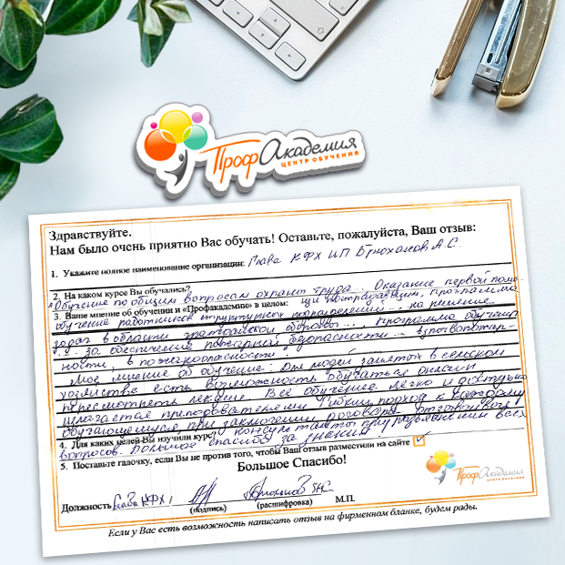 Спасибо Профакадемии за доступное обучение, наши сотрудники с легкостью прошли все курсы, информация в виде презентаций изложена очень четко, лаконично и быстро усваиваться. Мы уже стали Вашими постоянными учениками, будем и дальше взаимодействовать. С вами приятно работать