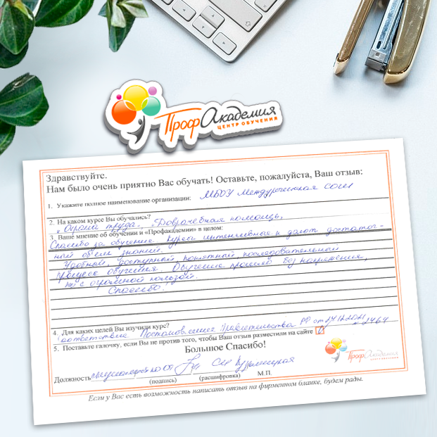Обучение в "Профакадемия" стало для нас одним из важнейших этапов в нашей библиотечной жизни и всего Учреждения в целом. Высокая квалификация преподавателей и база знаний помогают нам сегодня в работе. Ваши педагоги компетентные, доброжелательные, грамотные и знающие свое дело. Те знания, которые вы нам даете, действительно, очень помогают в работе. Хотим выразить огромную благодарность всему вашему коллективу за внимание, знания, прекрасное отношение. Желаем ООО "Профакадемия" дальнейшего процветания и дальнейшего сотрудничества!