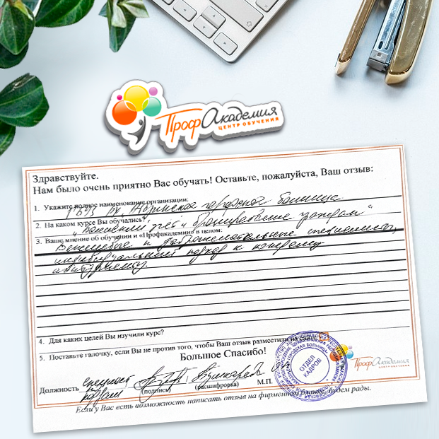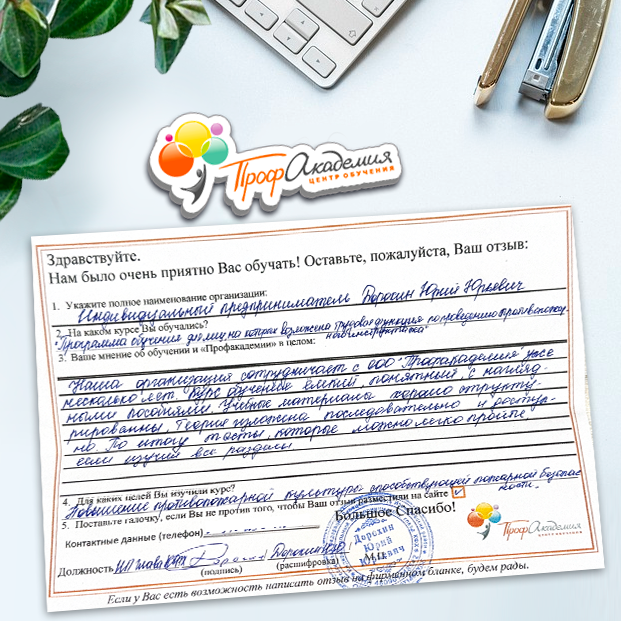 Наши сотрудники неоднократно проходили обучение в Вашей академии и с огромным удовольствием вернемся к Вам снова. Все доступно, понятно и отлично! Большое спасибо!
