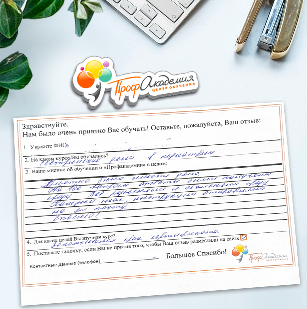 Хочу выразить огромную благодарность всей группе Профакадемии. Понравилось все. Вся информация об обучении находится в доступной форме. Очень боялась когда нашла обучение, но все оказалось намного проще. Надеюсь все что изучила за время обучения станет замечательным фундаментом для моей новой жизни.